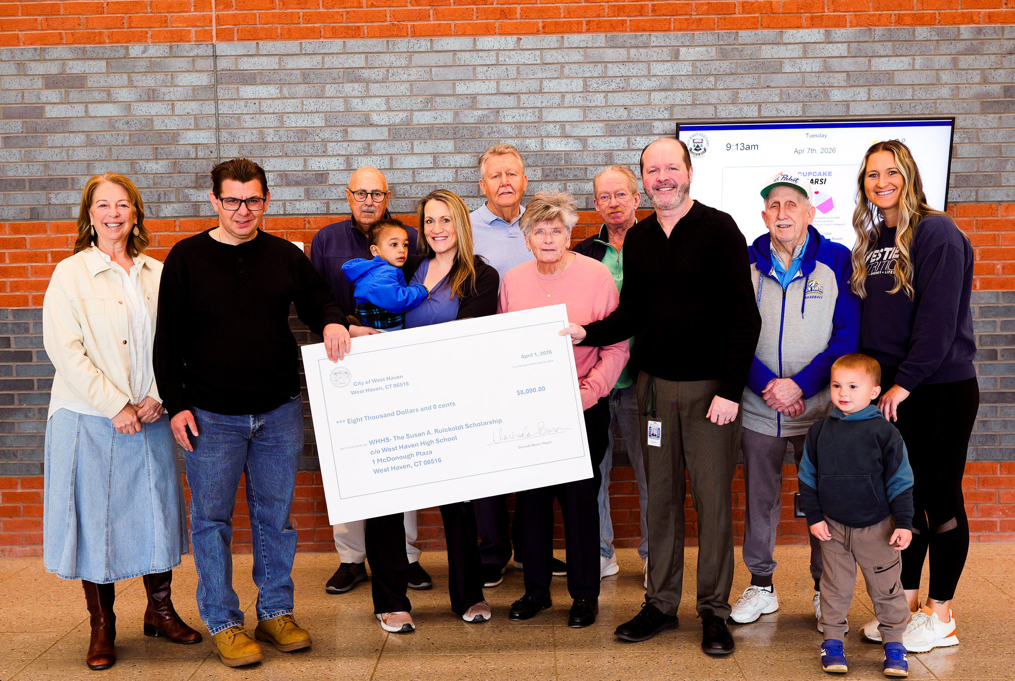 West Haven High School Principal Robert Bohan, third from right, receives an $8,000 donation from, from left, Mayor Dorinda Borer and Douglas J. Ruickoldt on behalf of the West Haven Breast Cancer Awareness Program on April 7 to benefit the Susan A. Ruickoldt Scholarship Fund.