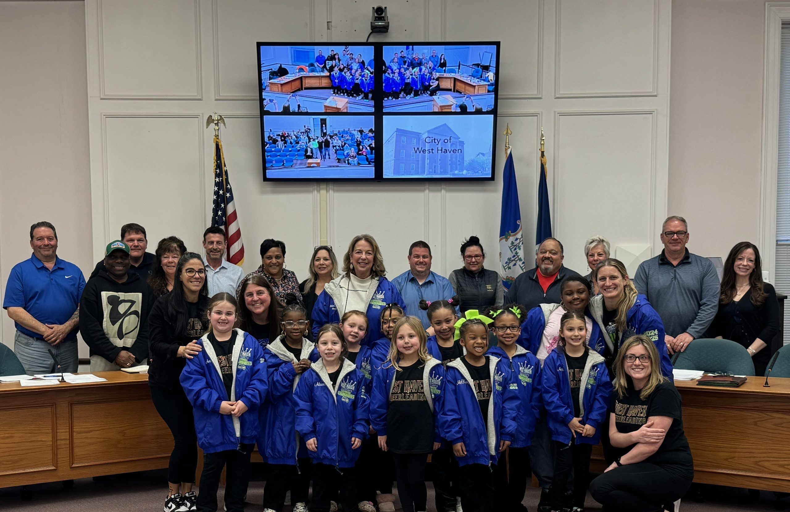 Mayor Dorinda Borer and the City Council honored members of the West Haven Seahawks Tiny Mite and Mitey Mite cheerleading teams during the council’s April 13 meeting at City Hall. Borer, joined by council members, read and presented a proclamation to the undefeated Tiny Mite squad, led by coach Stephanie Cerillo, for winning the Southern Connecticut Conference Championship, the Tri-State Conference Championship and the New England Regional Championship, culminating in the national championship. Borer also read and presented a proclamation to the Mitey Mite squad, led by coach Whitney Finnegan, for winning the Southern Connecticut Conference Championship, the Tri-State Conference Championship and the Queen City National Championship.