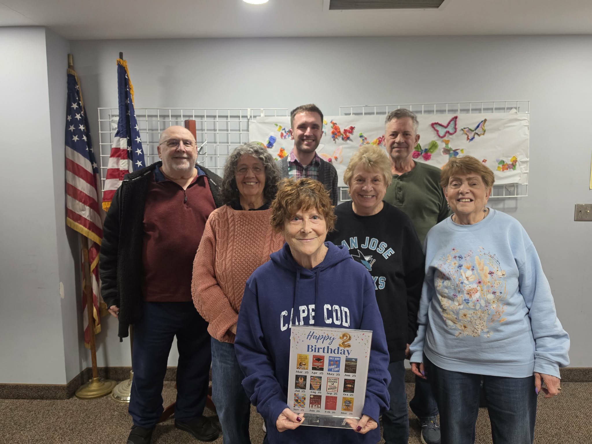 The Main Library's Monday Book Club celebrated its second birthday last month! Pictured are members Charlie, Beverly, Nick, Roberta, Sandy, Bill, and Frances.