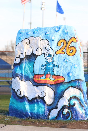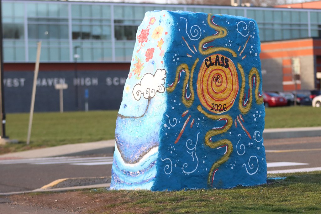 Art classes under the direction of teachers Richard DeBiase, Jennifer Lucibelli, and Emily Brenes spent time April 9 to put the Class of 2026’s imprint on the monolith that stands outside of the entrance of Ken Strong Stadium. A total of 23 students took part in the annual project. Once in the courtyard of the former high school, the rock has been used to show various images that characterize the outgoing seniors each spring. The images will remain on the stone until the Class of 2027 makes its mark next spring.