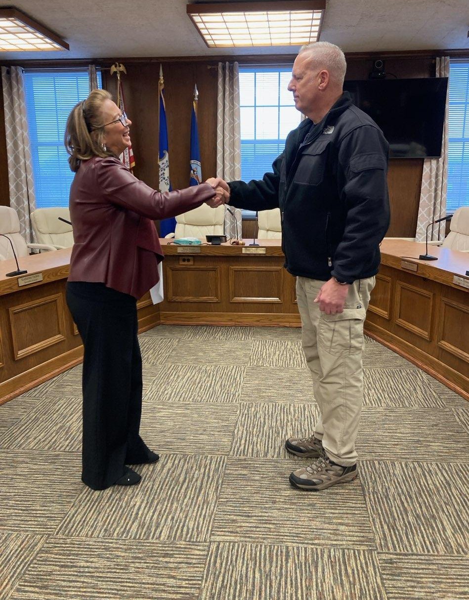 New officerMayor Dorinda Borer congratulates newly sworn-in University of New Haven police Officer Gregory LeBeau during a ceremony at City Hall on Monday. Attending the ceremony were Ronald M. Quagliani, UNH’s associate vice president of public safety and administrative services, along with UNH Deputy Chief Brett Mahoney, Chief Adam Brown and Sgt. Kevin Holster. -