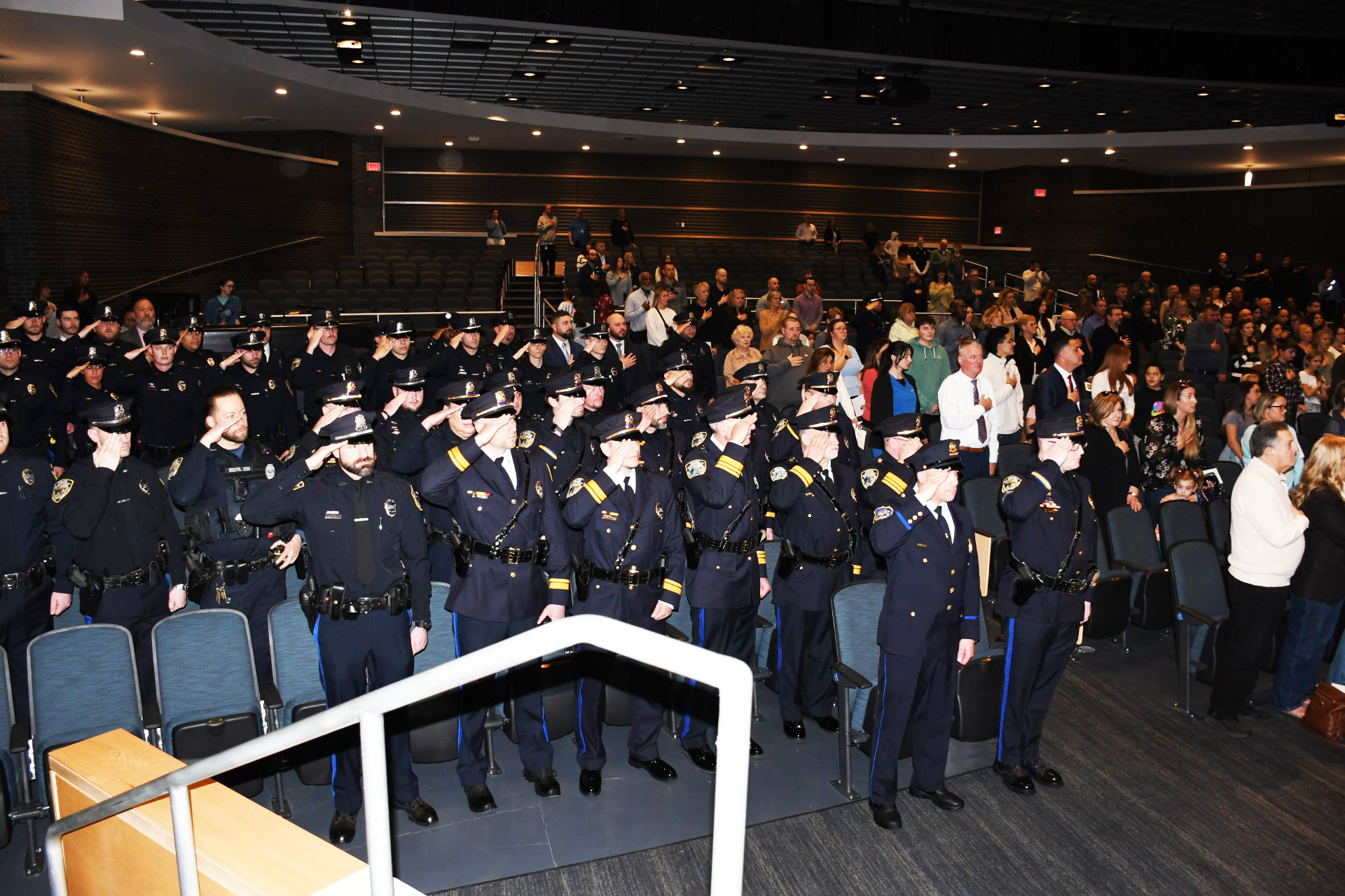 WHPDCity officers salute during the Police Department’s annual awards ceremony March 10 in the West Haven High School auditorium. Chief Joseph S. Perno and Mayor Dorinda Borer, not pictured, recognized several members of the department at the ceremony, which highlighted “the dedication, professionalism, and commitment our officers demonstrate every day while serving our community.” Perno and Borer delivered remarks and awarded certificates of commendation and unit citations to officers “who have gone above and beyond in the performance of their duties.” They also awarded such special commendations as the Lifesaving Award, the Medal of Honor and the Purple Heart. -