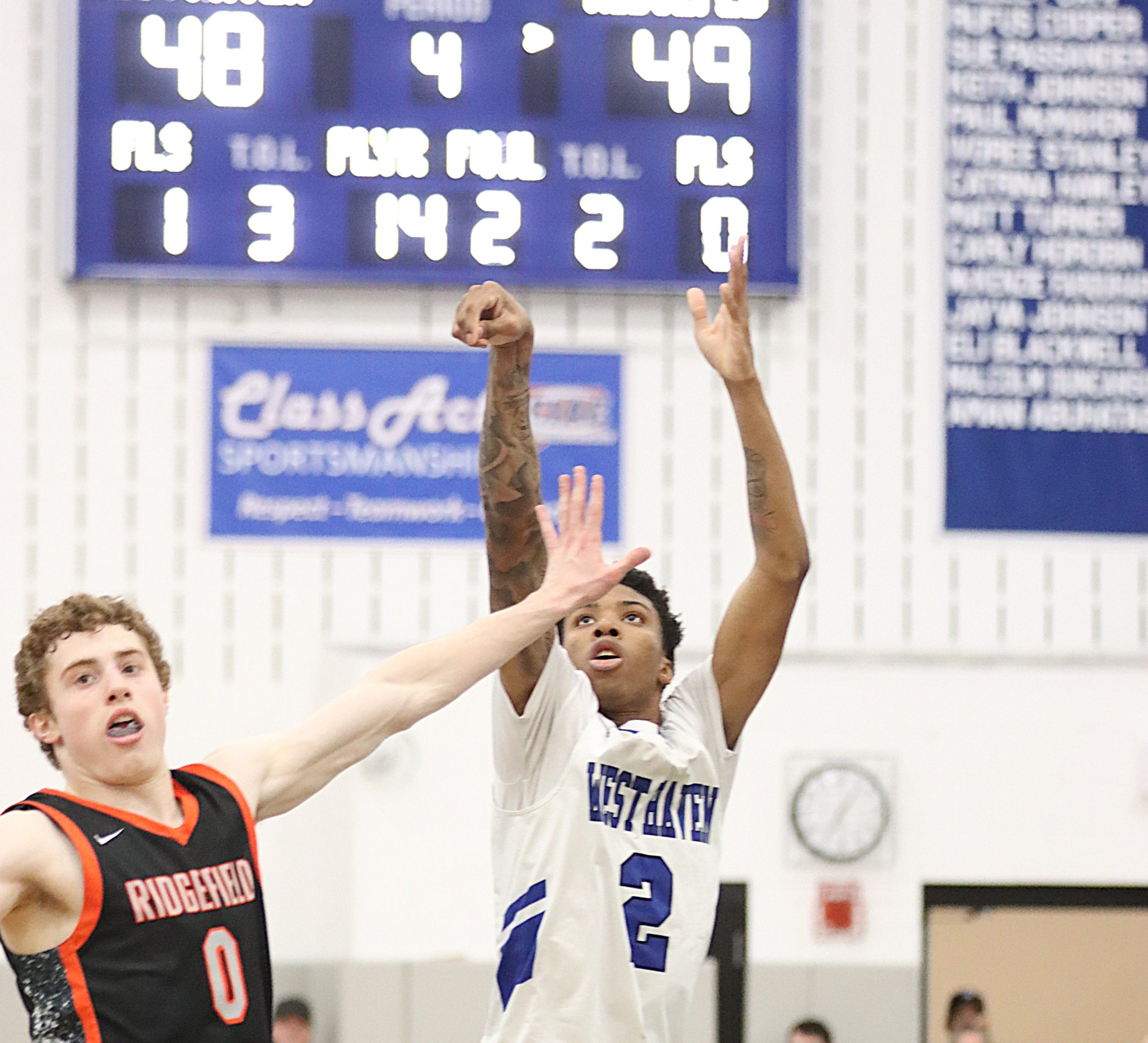 WHHS Sports Round UpAaron Johnson hits the three-pointer for the Blue Devils versus Ridgefield. -