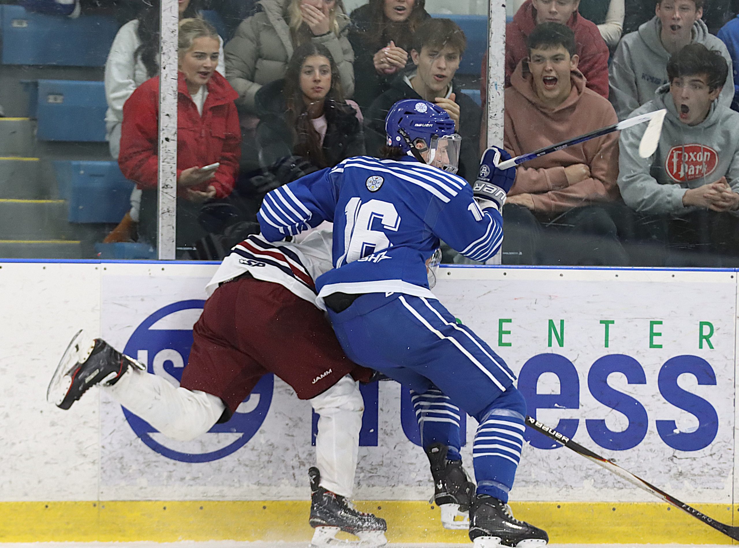 WHHS Sports Round UpLeo Mazurowski throws a body check in the Blue Devils' playoff game at Farmington.