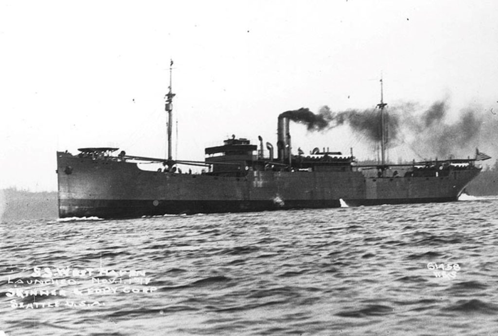 The 423-foot ship was built by Skinner & Eddy Corp., in Seattle, and was launched on Nov. 1, 1917, but would be acquired by the Navy on Christmas Eve of the same year. It would officially be commissioned by the Navy on June 18, 1918, which would see the ship officially renamed from War Flame to the USS West Haven, after briefly being just “West Haven.”